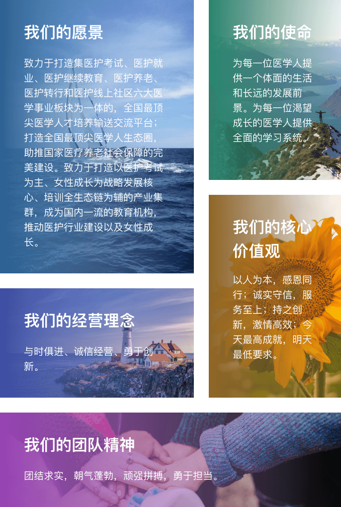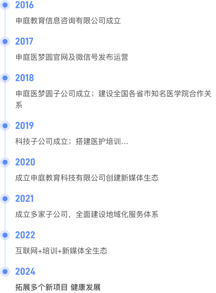 申庭教育成立至今,开设了医护考试、医护就业、医护继续教育、医护养老、医护转行和医护线上社区,是集六大医学事业板块为一体的全国优秀医学人才培养输送互联网平台