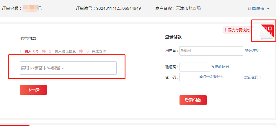 4.1跳转到银联支付页面后可以选择左边输入银行卡号支付,也可以点击右上角后用“银行卡云闪付”扫描支付。