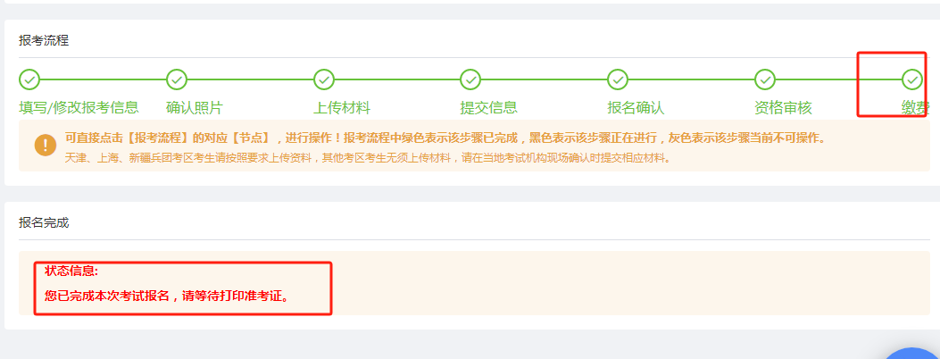 - 未开通网上缴费的考区,【资格审核】节点变绿即视为报名成功。
