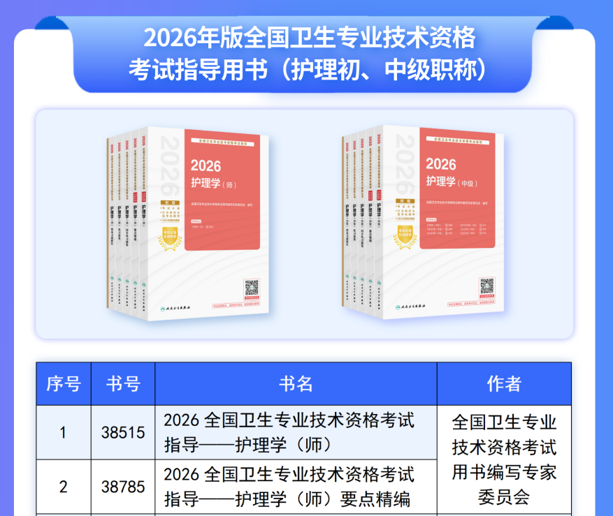 主管护师考试的官方指定教材由全国卫生专业技术资格考试用书编写专家委员会编写,人民卫生出版社出版,是备考的“风向标”,所有考点均围绕此教材展开,无论基础强弱,都必须优先掌握。2026年最新版官方教材已正式发行,核心必看书目分为四大类,精准对应考试科目和备考阶段,具体如下: